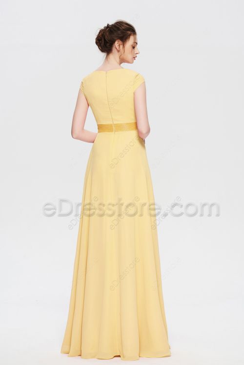 Modest LDS Beaded Pale Yellow Bridesmaid Dresses Cap Sleeves
