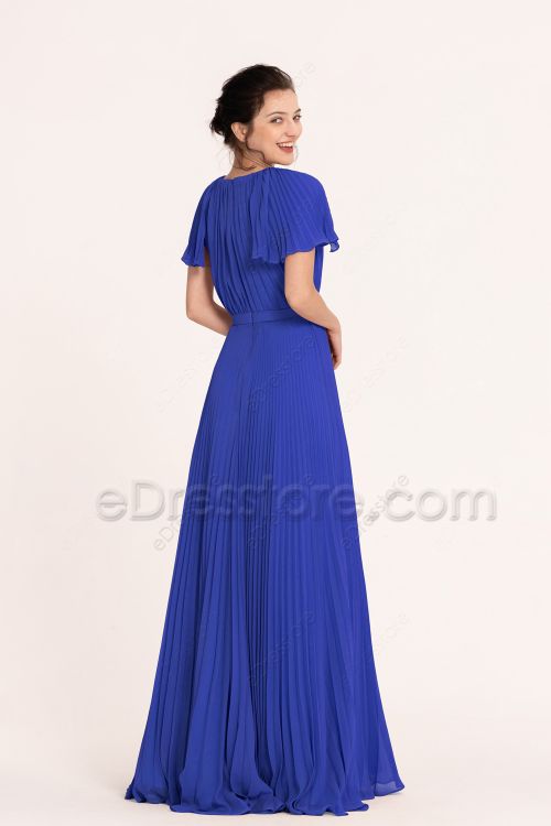 Drenched in regal allure, this bridesmaid dress in royal blue is a vision of refinement. The O neckline and short flutter sleeves complete the modesty, while the overall pleating adds depth and sophistication to the ensemble. The floor-length skirt completes the look with grace and charm.